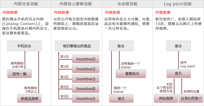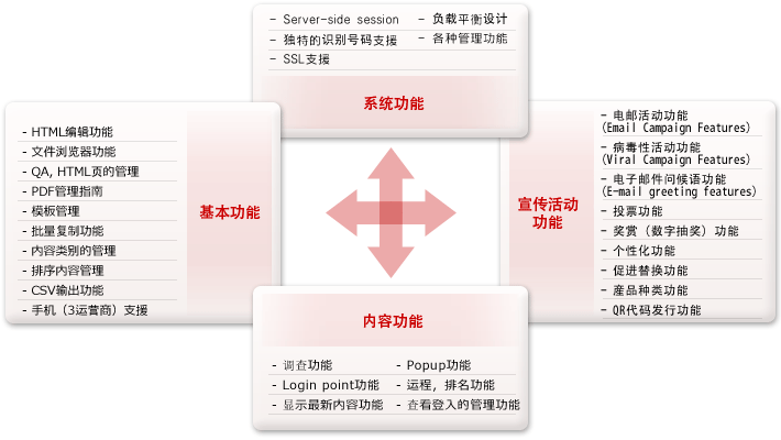 新内容显示功能,访问限制功能,分支内容功能,内容自动更新功能,下载功能,调査功能,运程,排名功能,查看登入的管理功能,个性化功能,Popup功能,奖赏(数字抽奖)功能,病毒性活动功能,电子邮件问候语功能,投票功能,查看日志管理,个性化的特点,功能弹出奖(批号),病毒性运动能力,电子邮件问候语的功能,投票功能,促进替换功能,Log point功能。